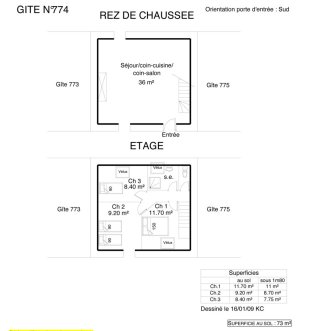 D'une surface totale de 75 m2, ce gîte est composé d'un salon avec cuisine intégrée, de 3 chambres, Il est équipé à l'étage, d'une chambre avec 1 lit de 150, 1 chambre avec 2 lits de 90 et 1 chambre avec 1 lit de 90, w.c. ind. et d'une salle d'eau.