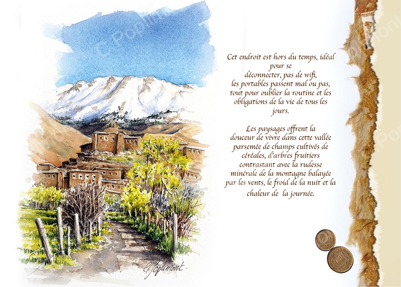Livre de 96 pages Couché Mat 170 gr avec couverture 400 gr, reliure dos carré cousu. Carnet de voyage réalisé au coeur de la vallée du Bougmez, puis direction la palmeraie de Skoura, la vallée aux roses pour finir dans les remparts d'Ait Benhaddou.